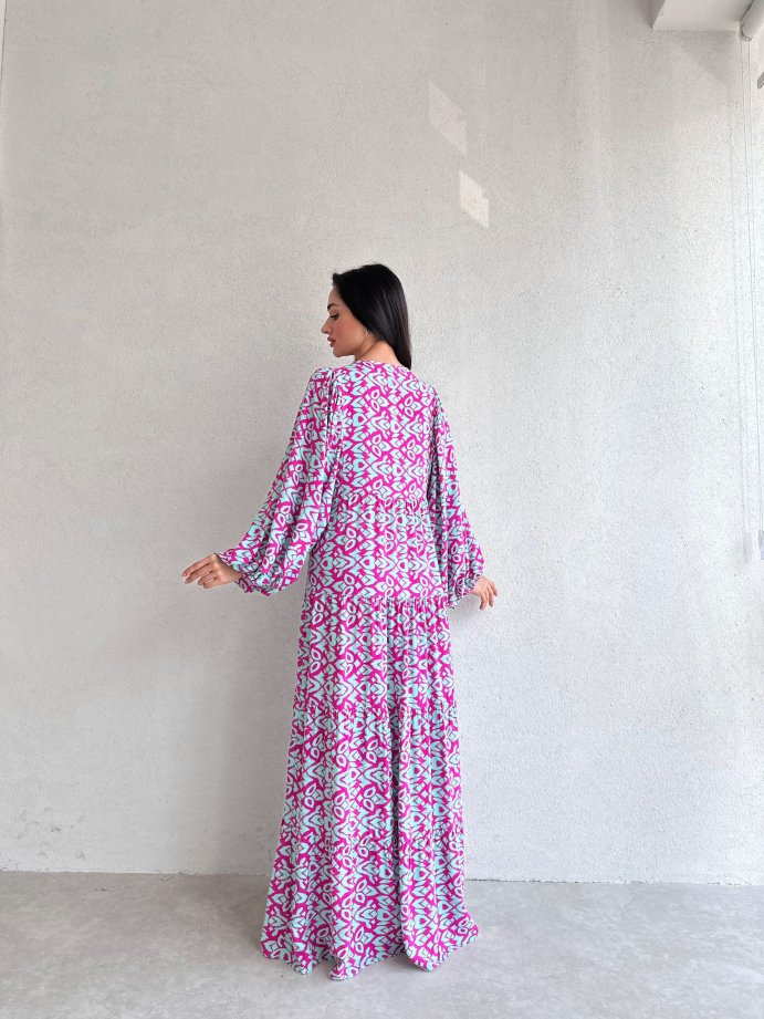 Asanoha Desenli Midi RUBY Elbise 4646 - Fuşya