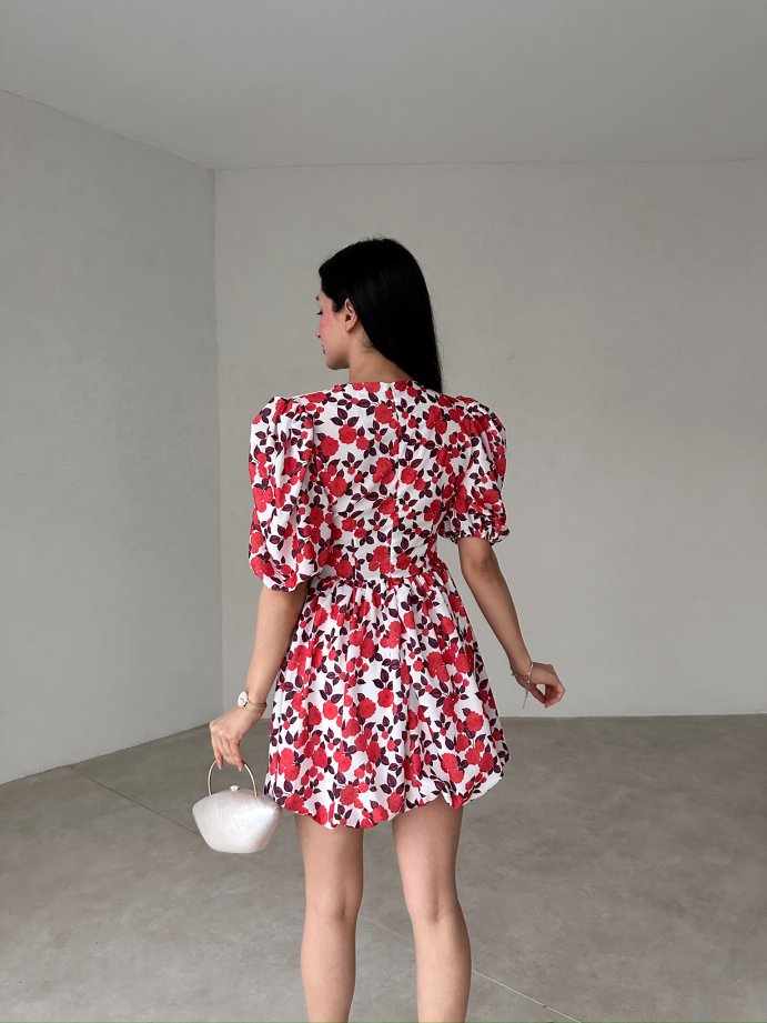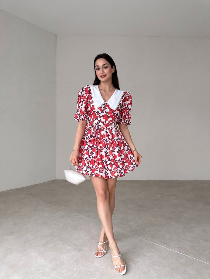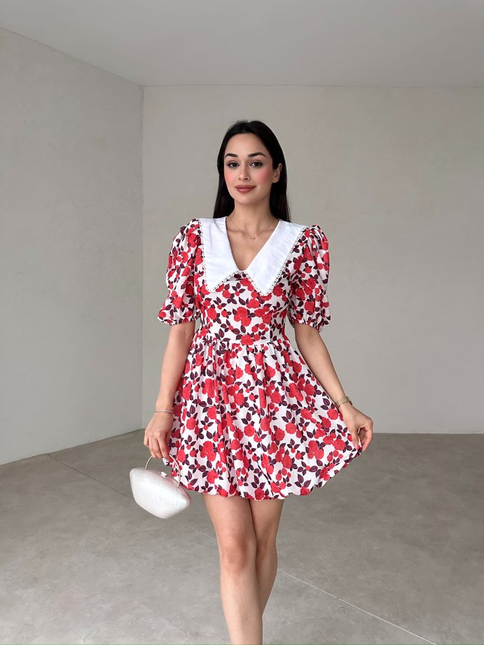 Bebe Yaka Çiçek Desenli Rochelle Elbise - Nar Çiçeği