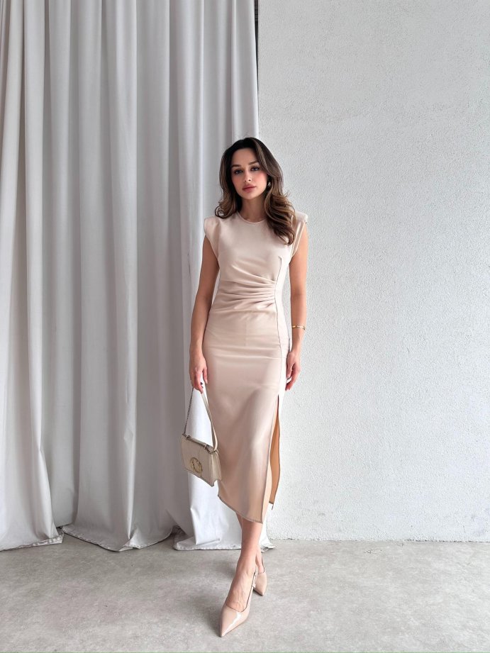 LİVA Puantiyeli Midi Elbise 8980 - Krem