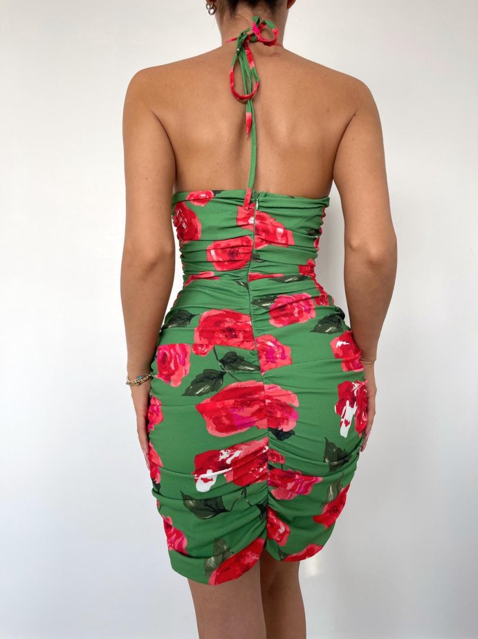 Çiçek desenli göğüs dekolteli Pauline elbise elbise tam kalıplıdır.