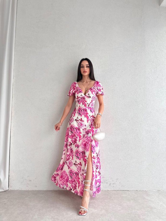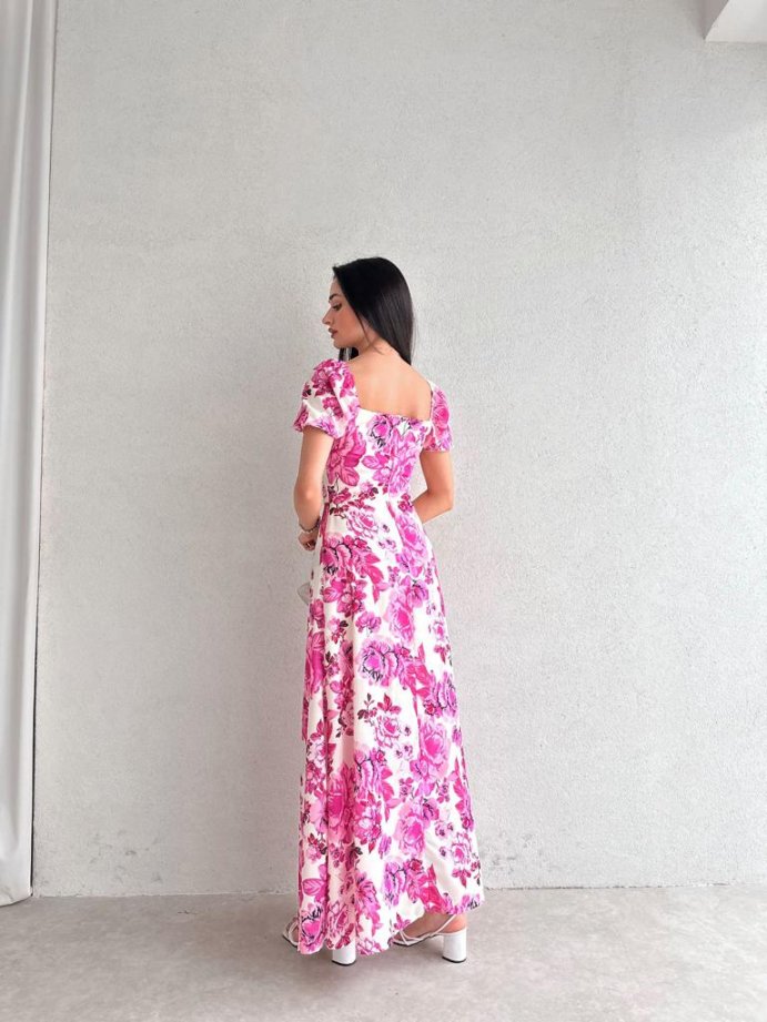 Çiçek Desenli Midi DAİSY Elbise 4200 - Fuşya