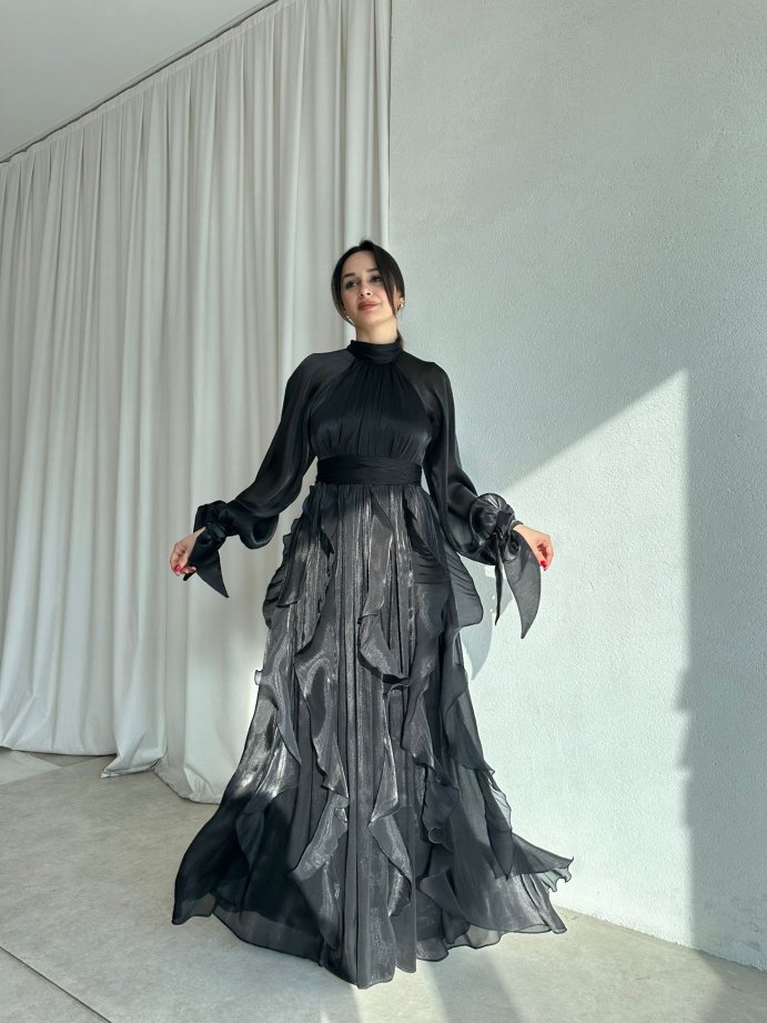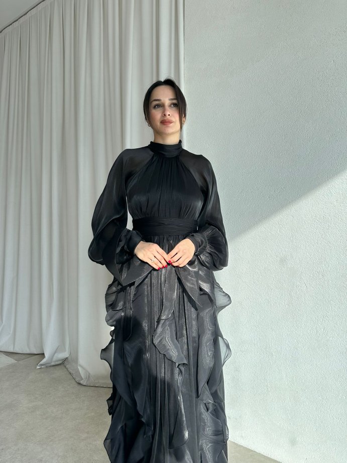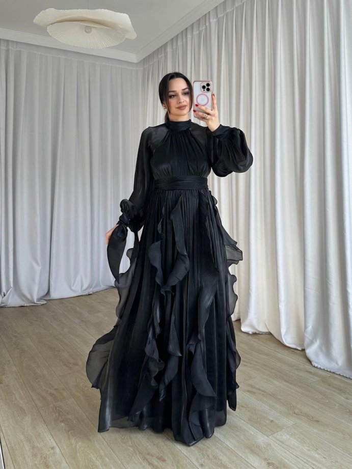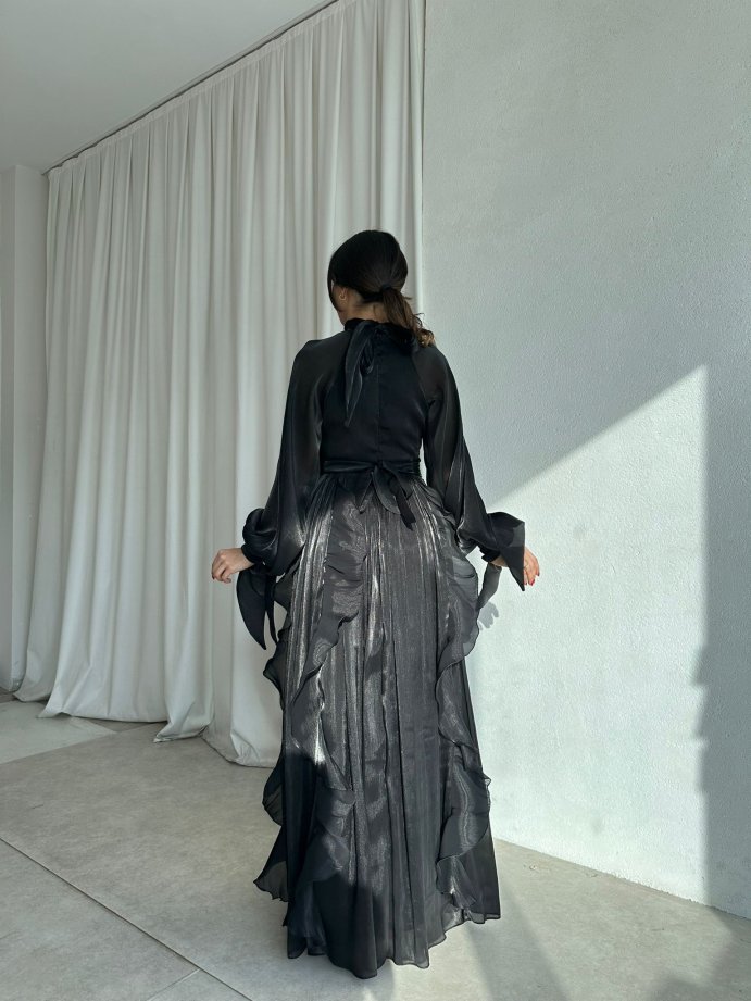 • Elbise kuşaklıdır, fermuarı arkadadır.