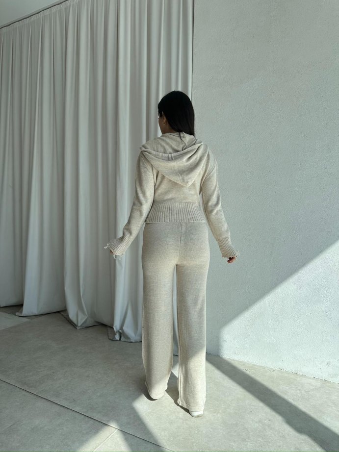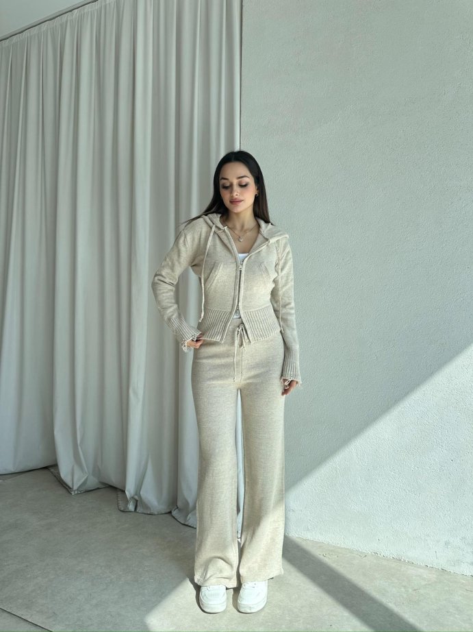 Takım üstü kapüşonlu ve fermuarlıdır.