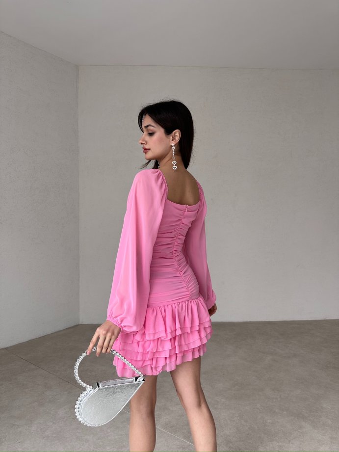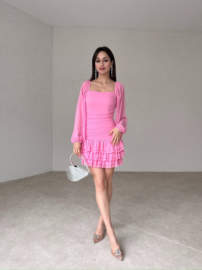 Etek Ucu Katlı Mini BROLİS Elbise 7582 - Pembe