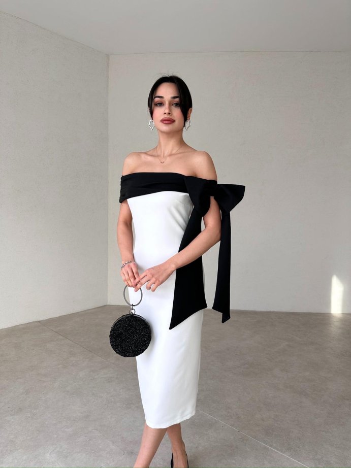 Fiyonk Detaylı Midi GENOVES Elbise 9293 - Beyaz