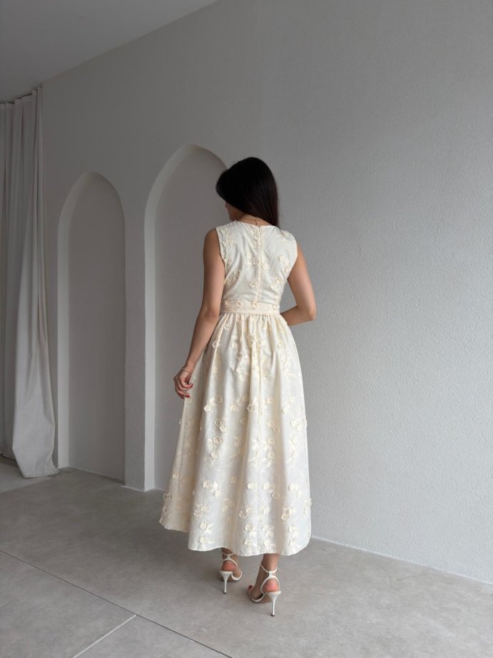 FORBES Çiçek Desenli Midi Elbise 9006 - Krem