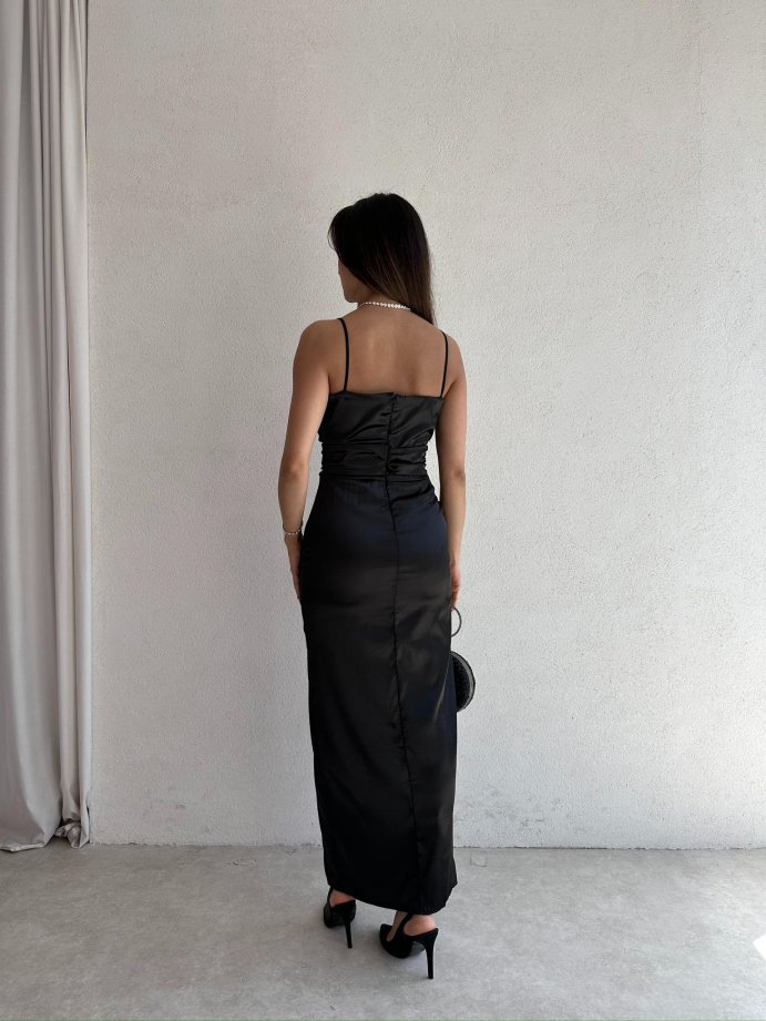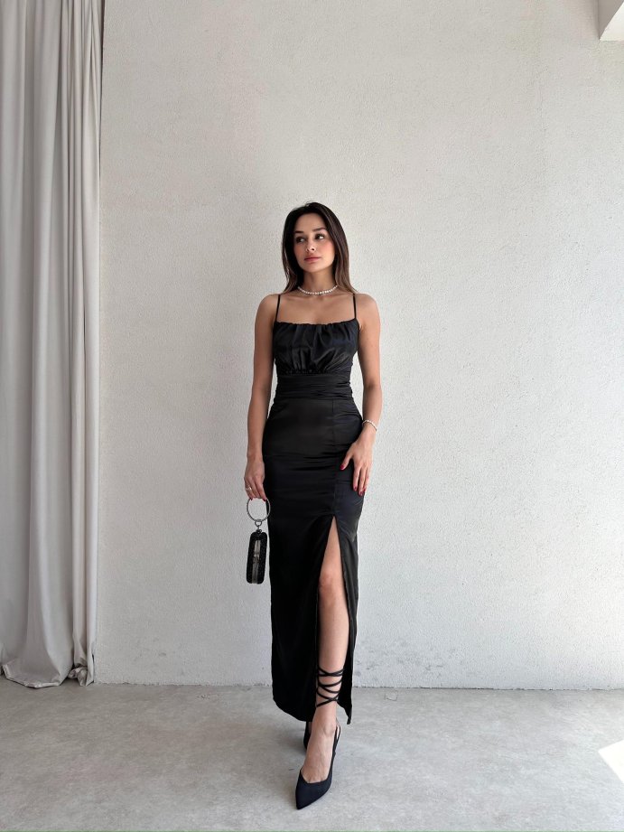 İnce askılı göğüsü drapeli vencover saten elbise tam kalıplıdır.