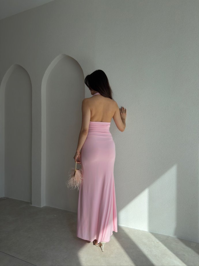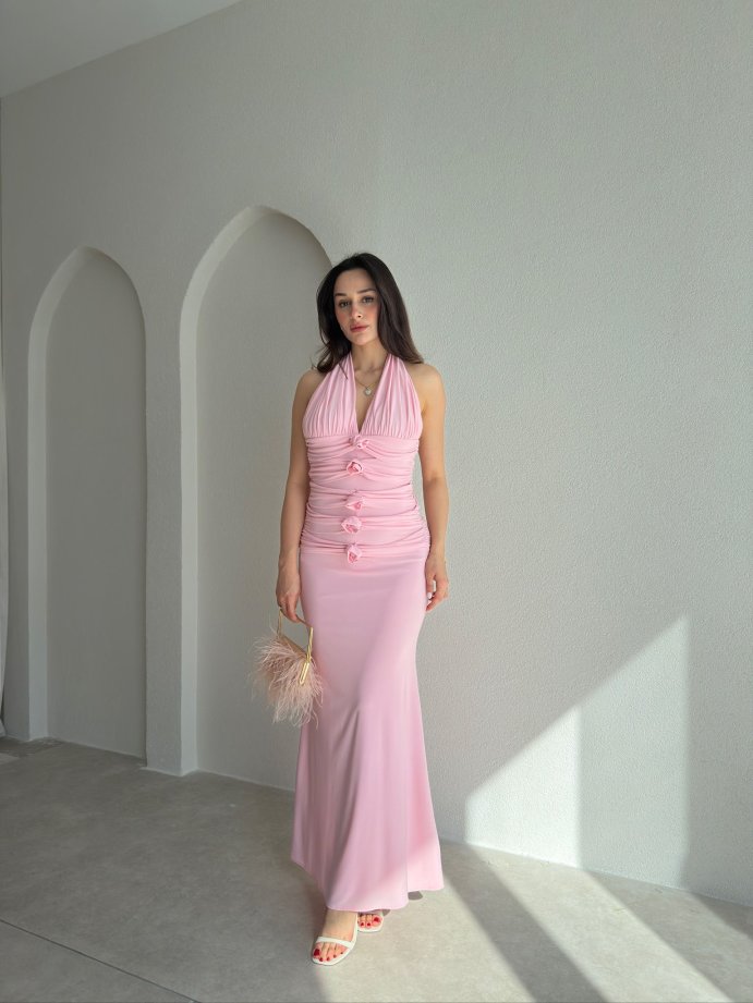 GRAMY Gül Detaylı Maxi Elbise 9041 - Pembe