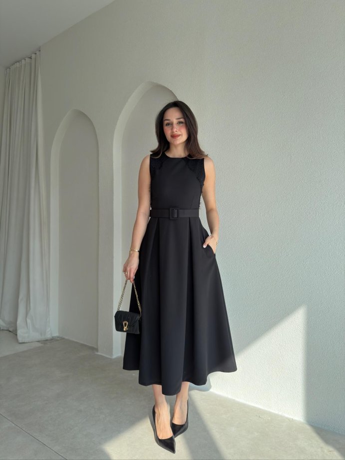 GROZA Dantel Detaylı Midi Elbise 9042 - Siyah