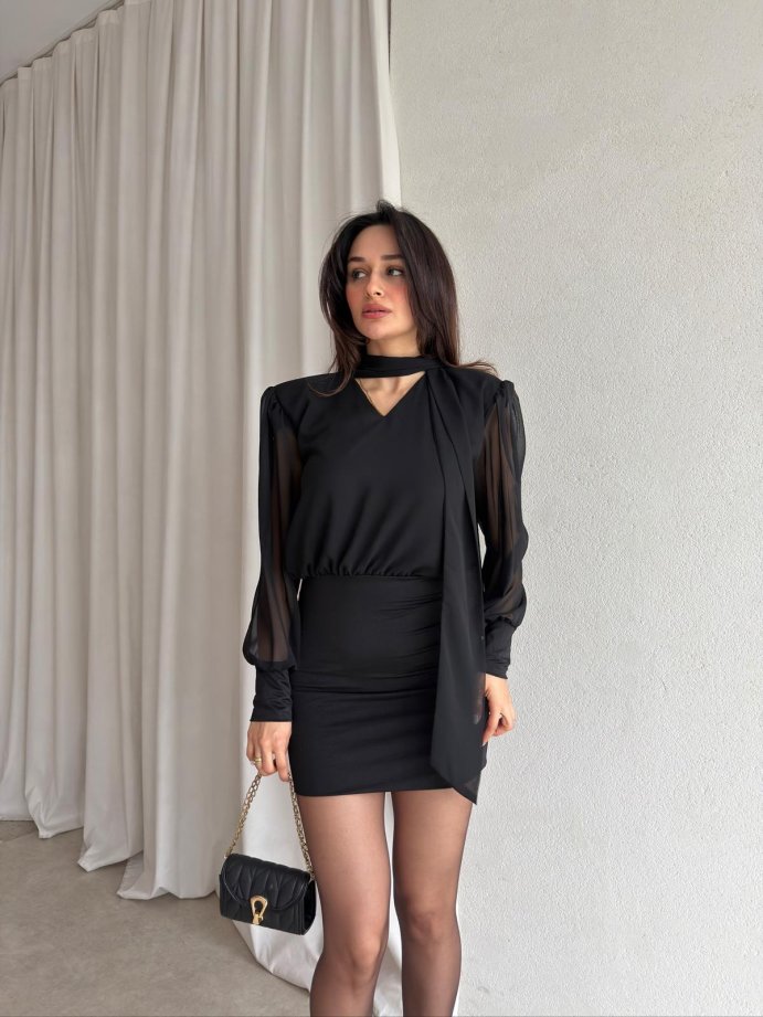 MONJE Kabartma Gül Desenli Mini Elbise 8974 - Siyah