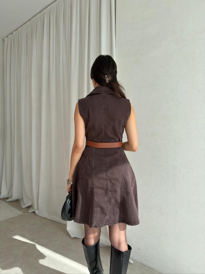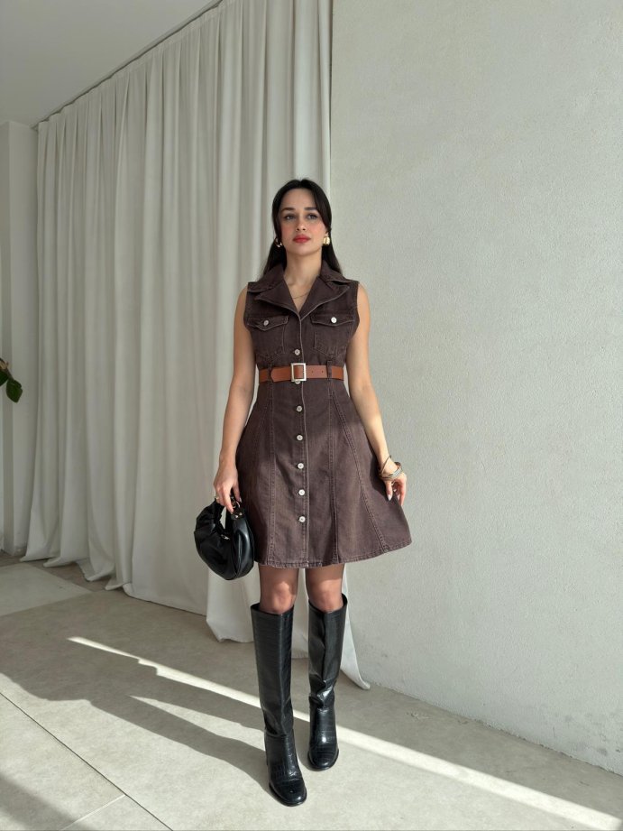 HOBBİT Kemerli Denim Elbise 8841 - Kahverengi