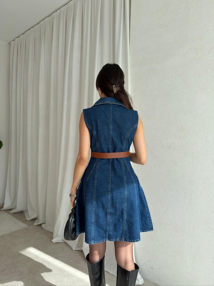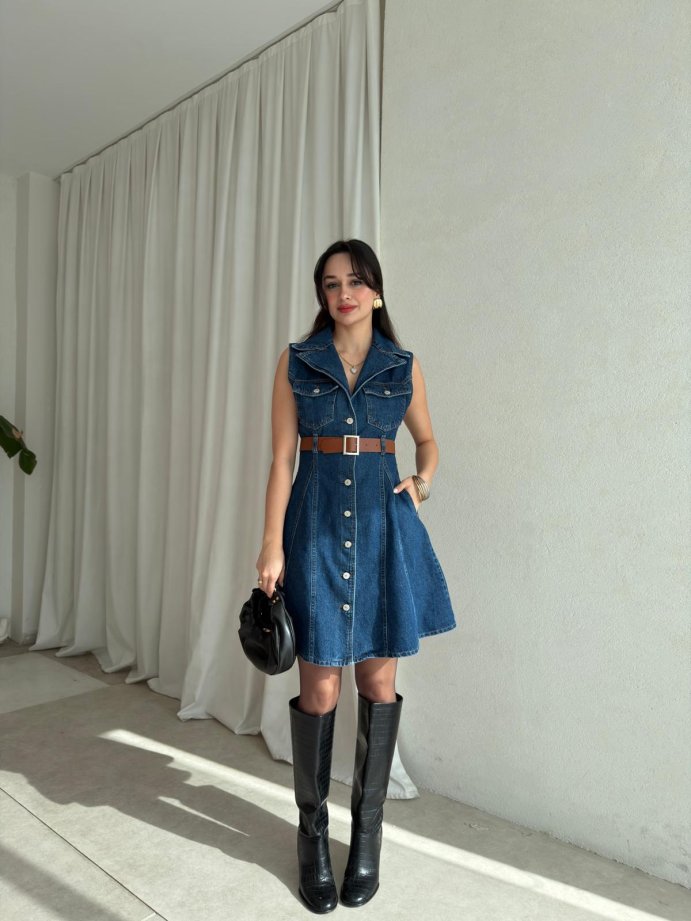HOBBİT Kemerli Denim Elbise tam kalıplıdır.