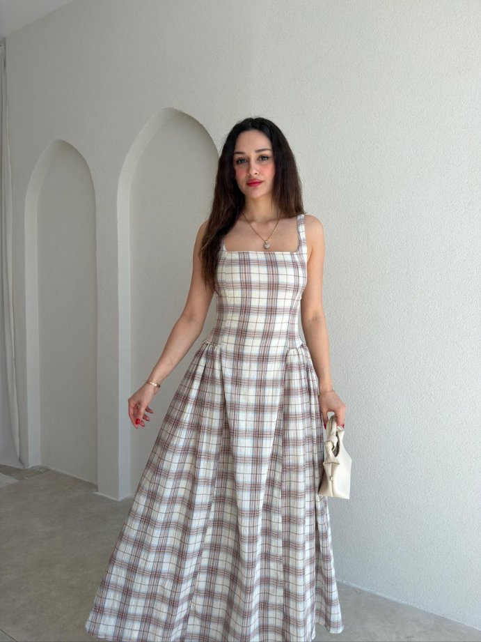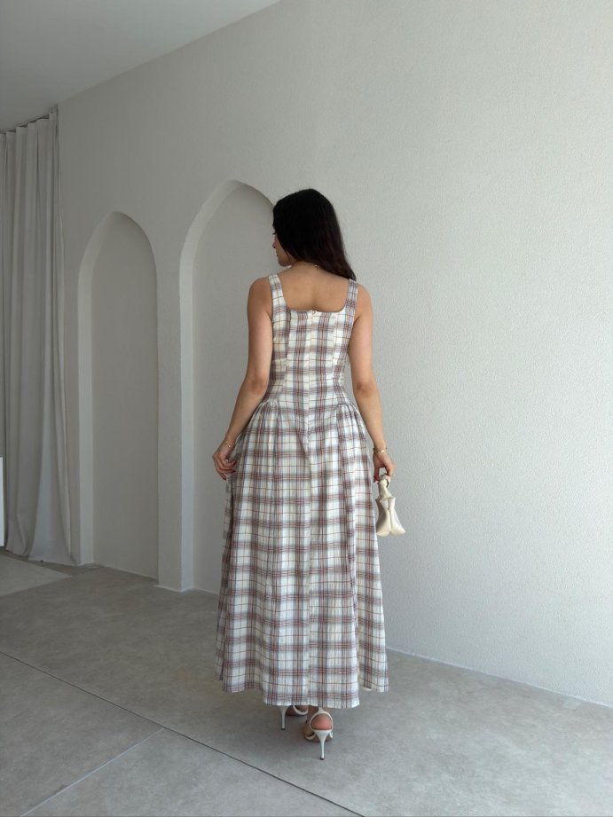 HUNTER Ekoseli Maxi Elbise 5469 - Krem