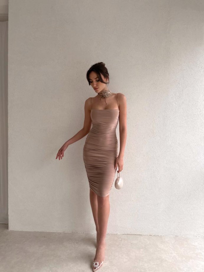 İnce askılı drapeli nikki elbise tam kalıplıdır.