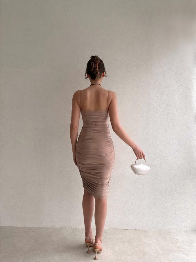 İnce Askılı Drapeli Nikki Elbise - Bej