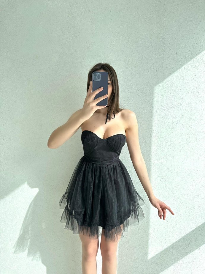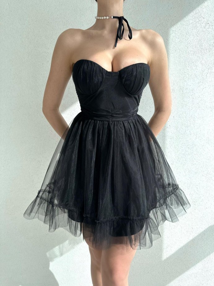 İnce Tütü Detaylı Straplez Elegant Elbise 2972 - Siyah