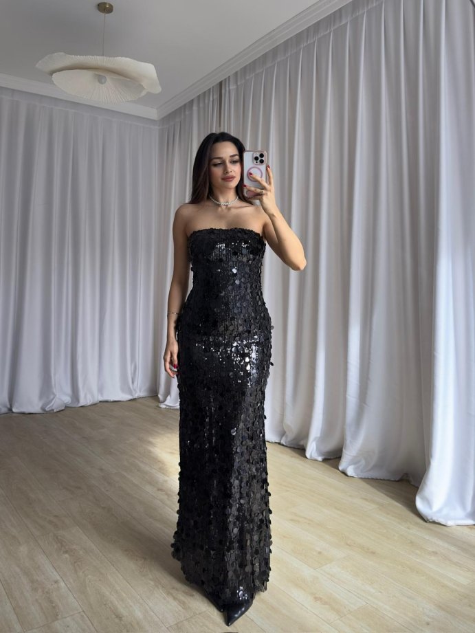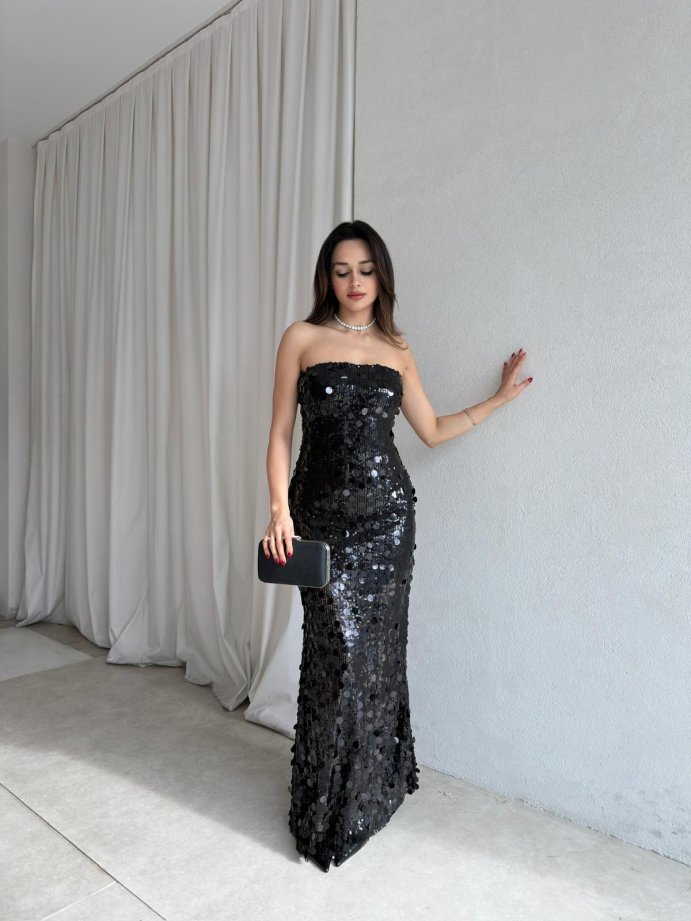 • JADORE Payetli Maxi Elbise tam kalıplıdır.