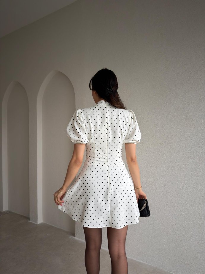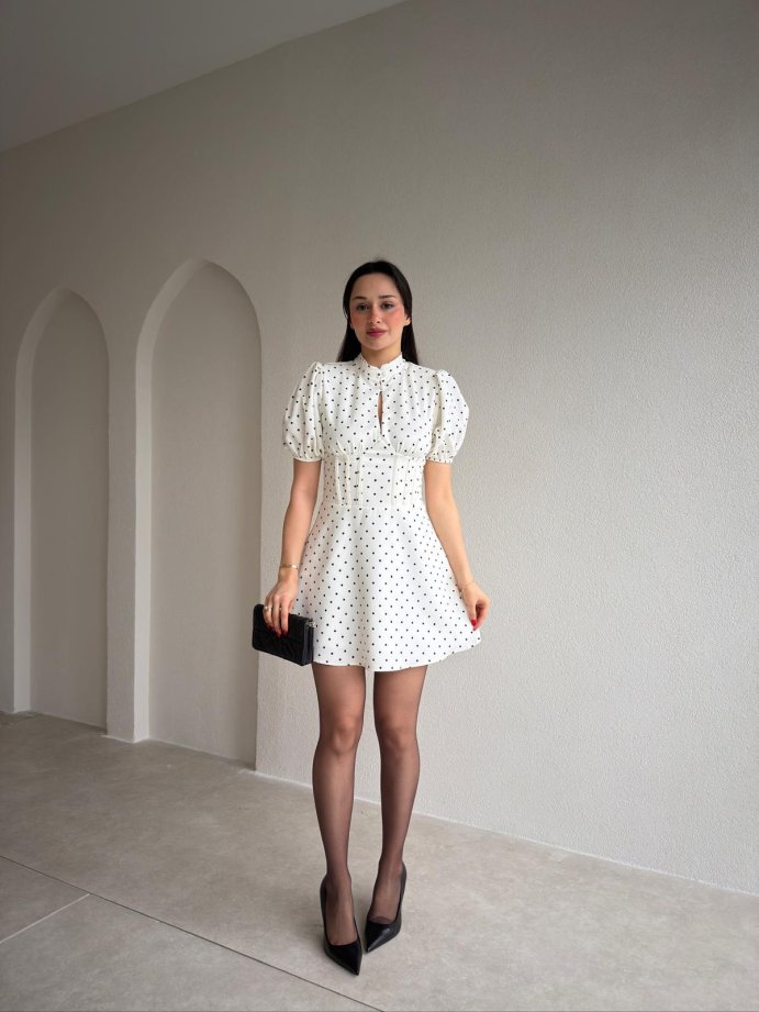 JULES Korse Detaylı Puantiyeli Mini Elbise 9012 - Beyaz