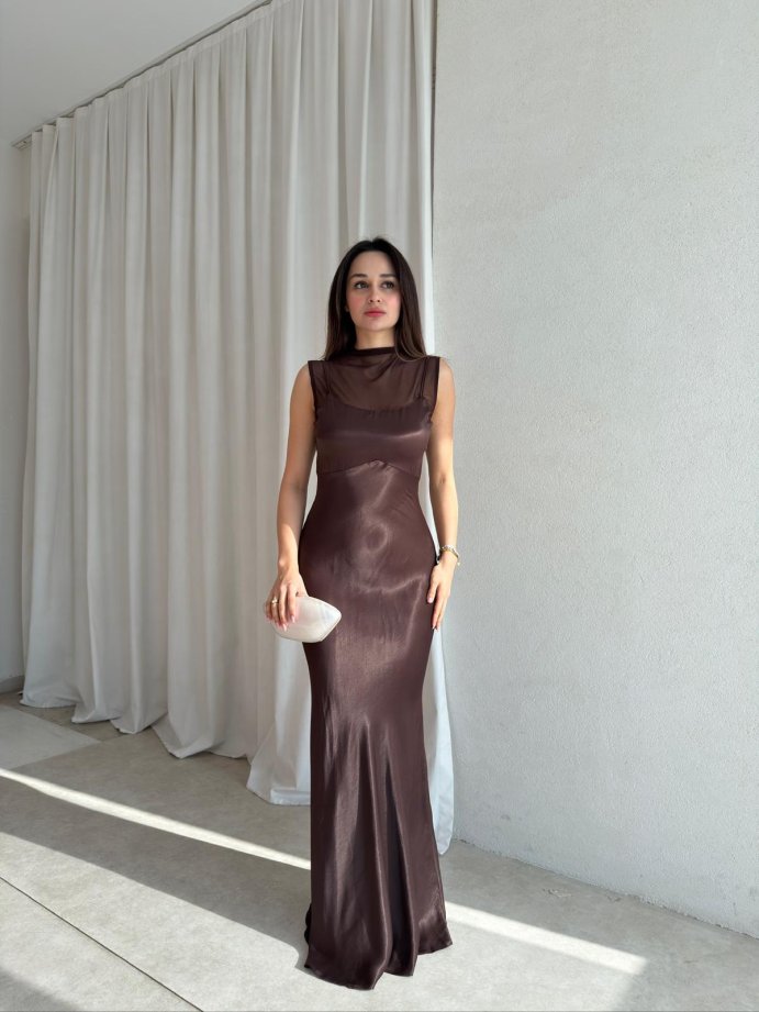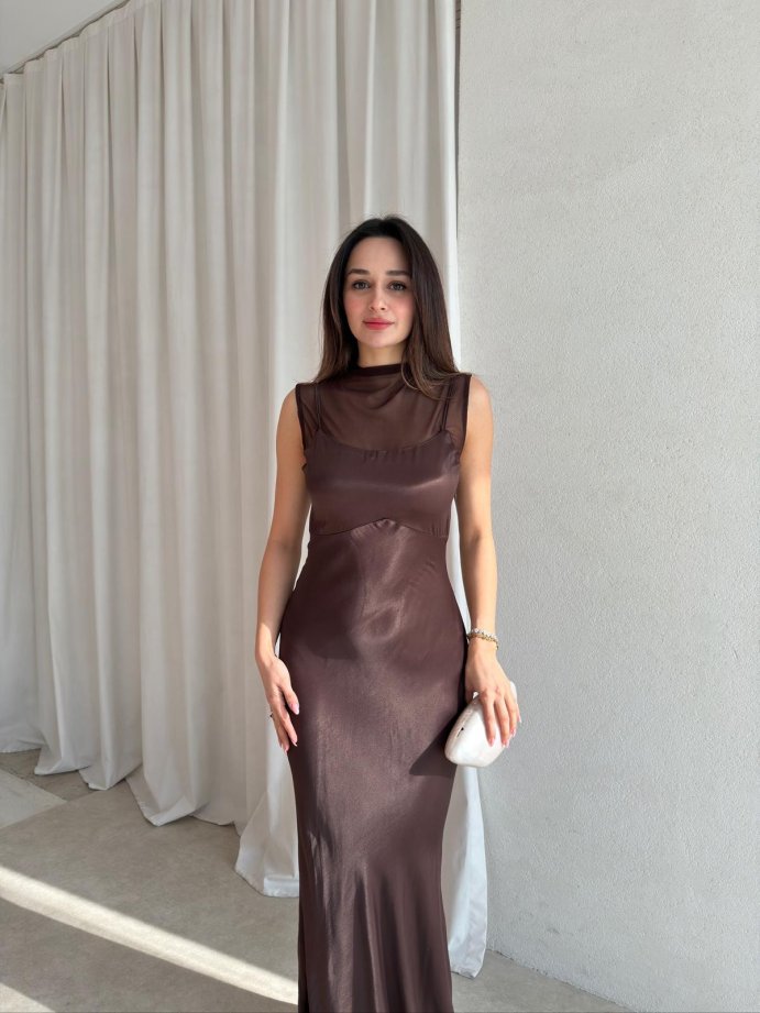 JUSTİN Saten Maxi Elbise 8825 - Acı Kahve