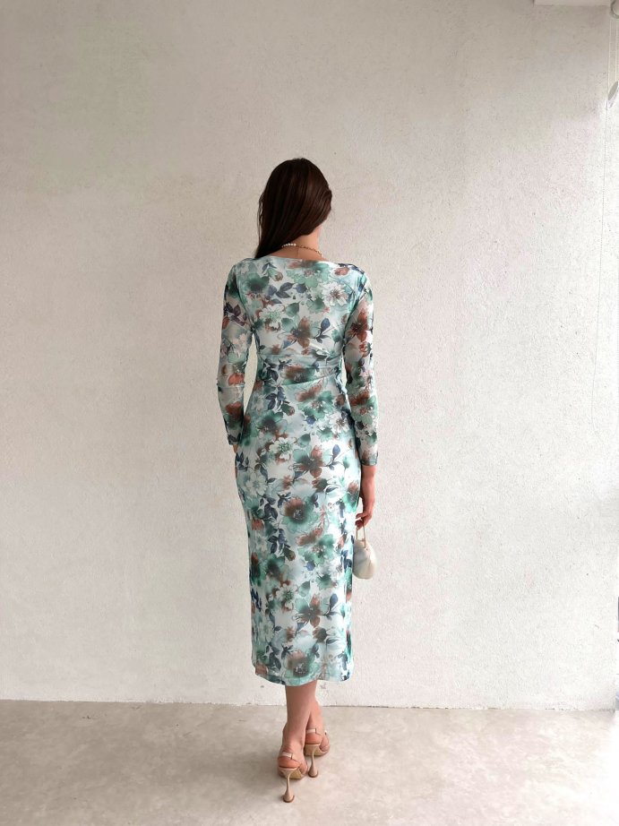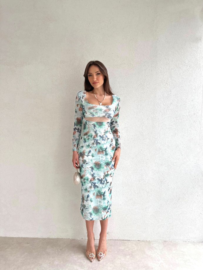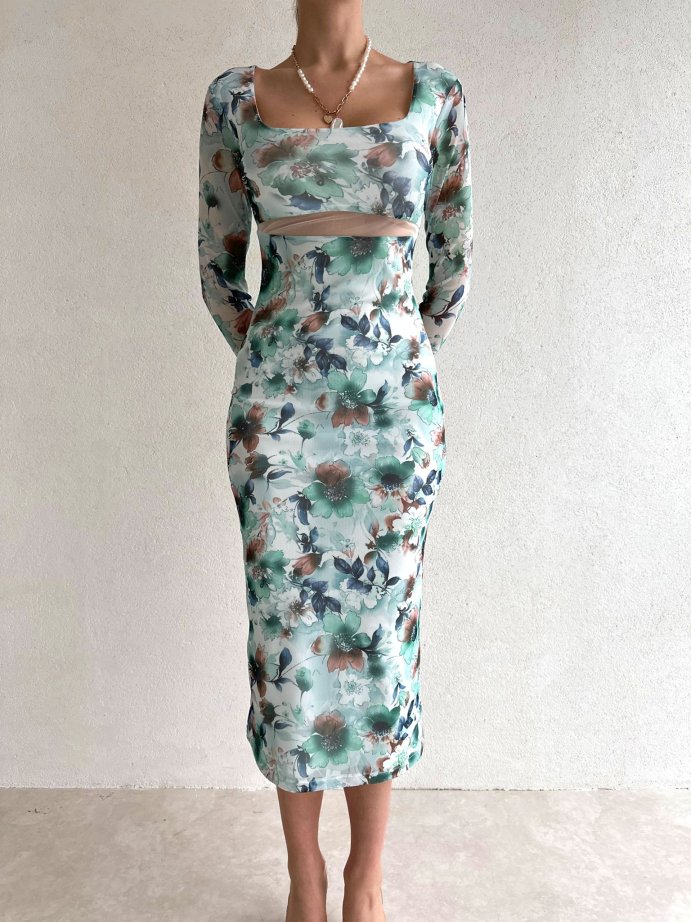 Kare Yaka Çiçek Desenli Midi Loren Elbise 5631 - Yeşil