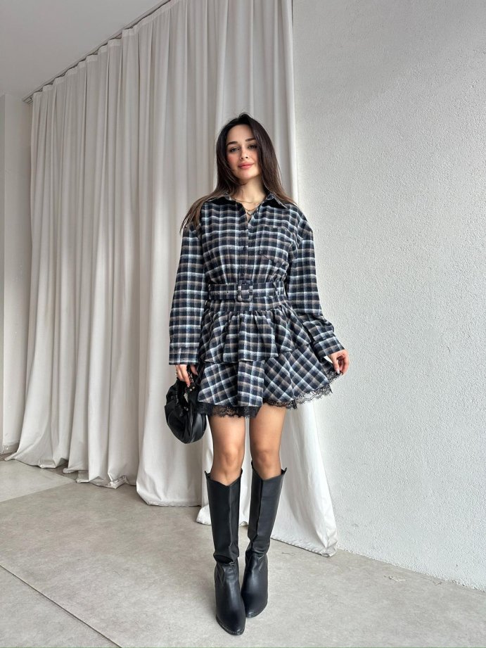 • LUCKY Ekose Mini Elbise tam kalıplıdır.