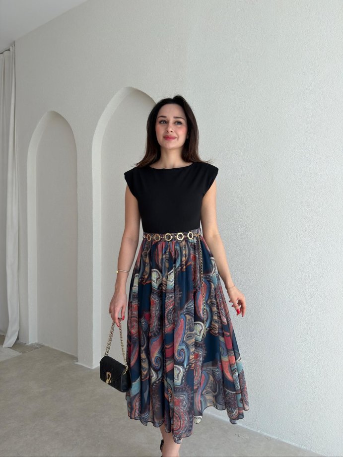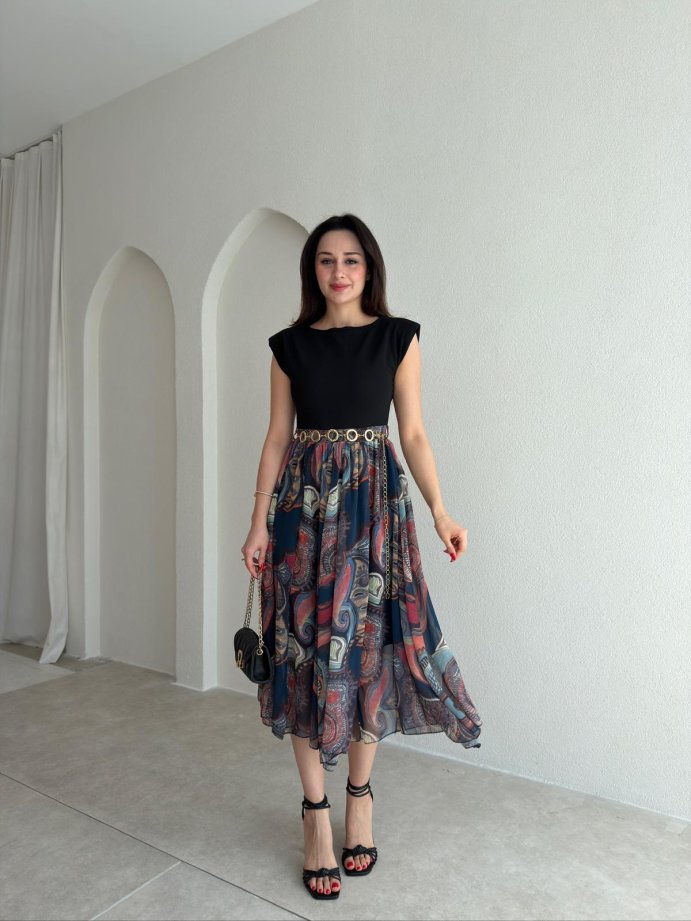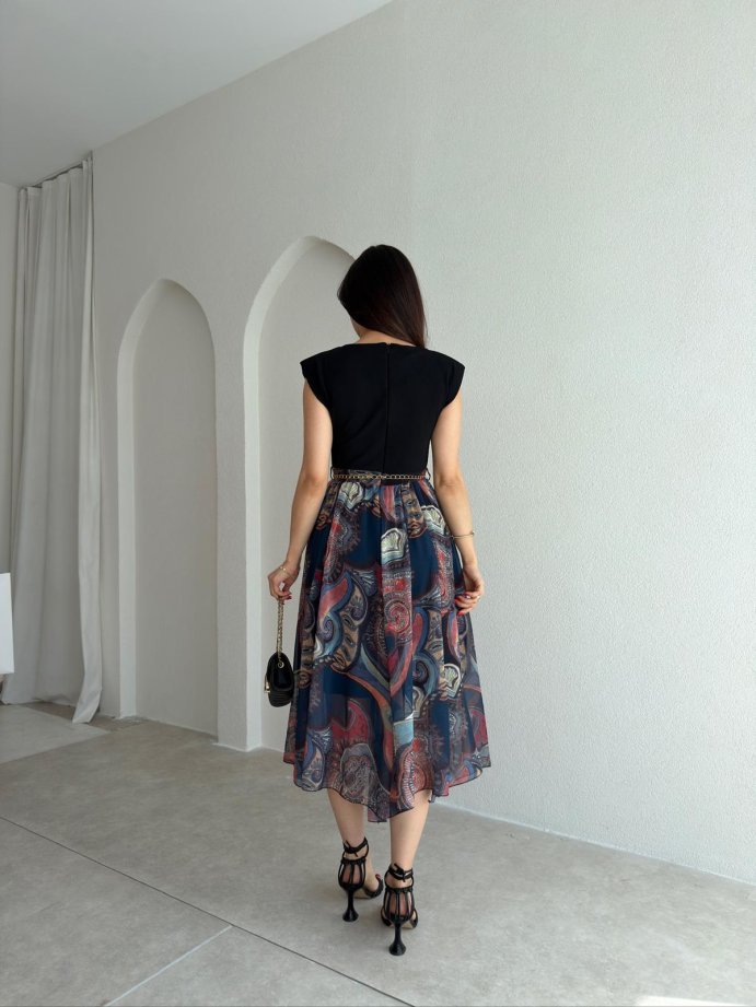 NOJİTA Altı Desenli Midi Elbise 0281 - Lacivert