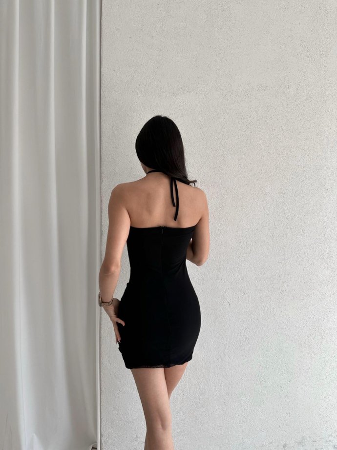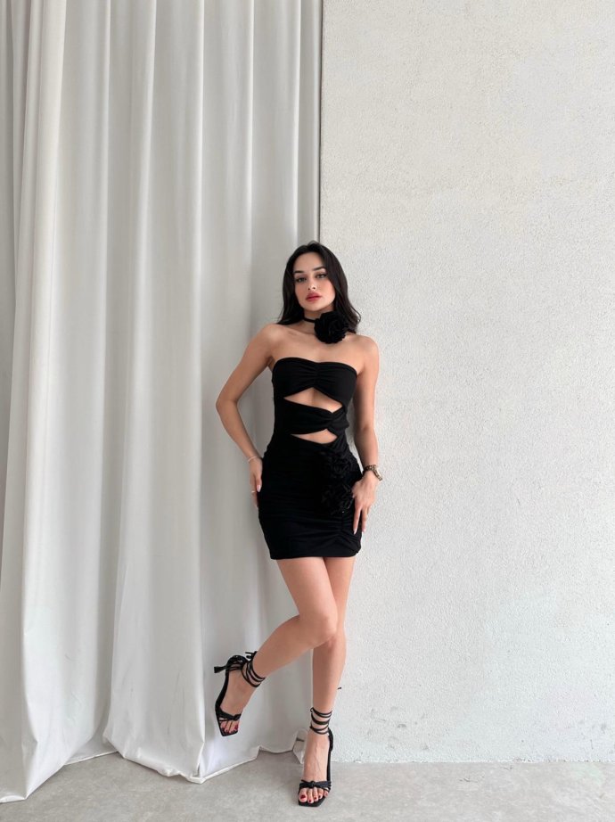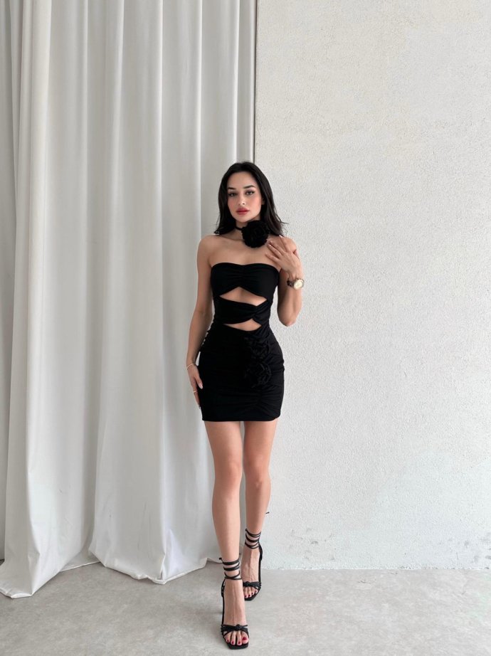 Ortanca Çiçeği Detaylı Mini ALİSON Elbise 5352 - Siyah