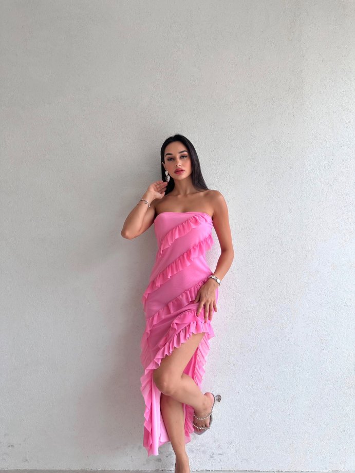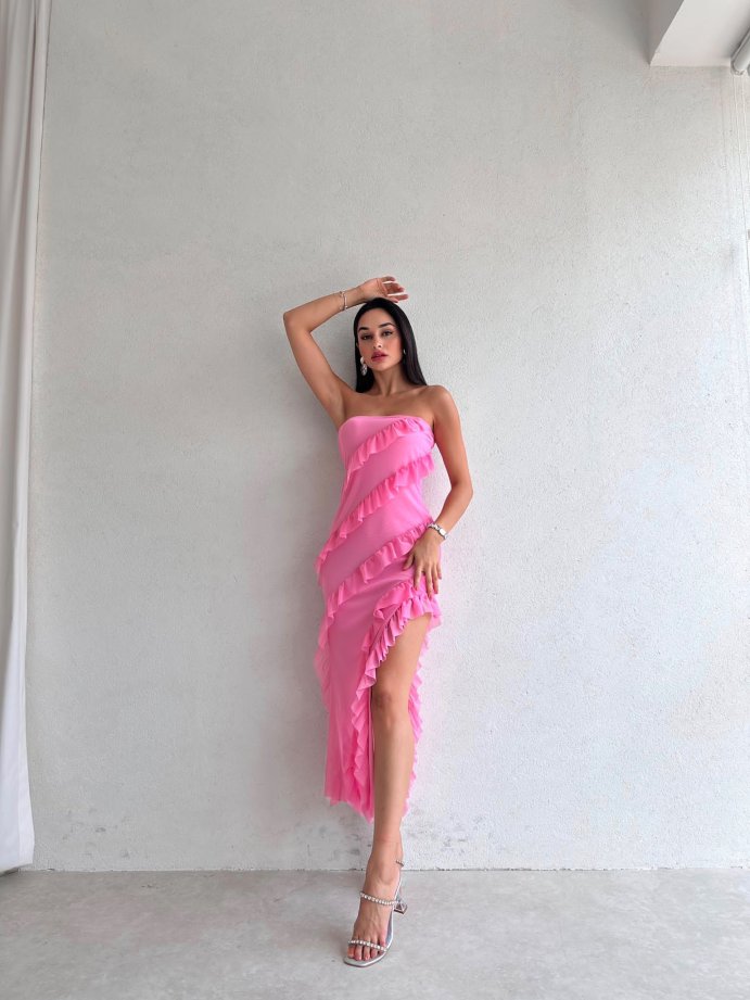 ZİLEY Gül Detaylı Midi Elbise 8117 - Pembe