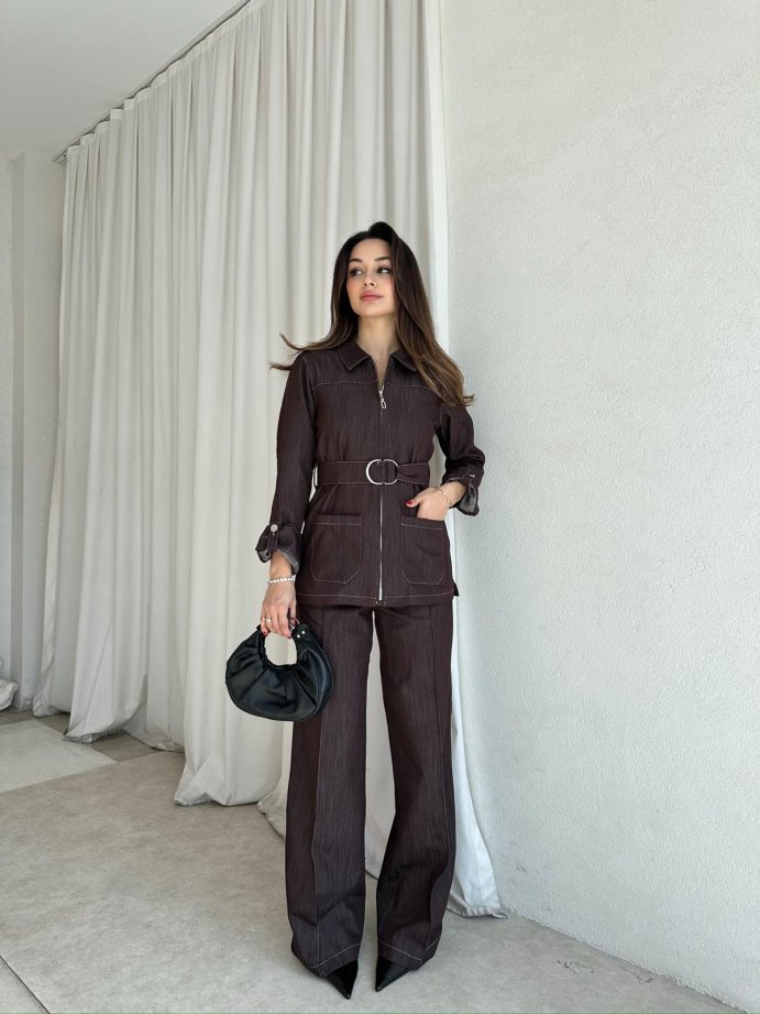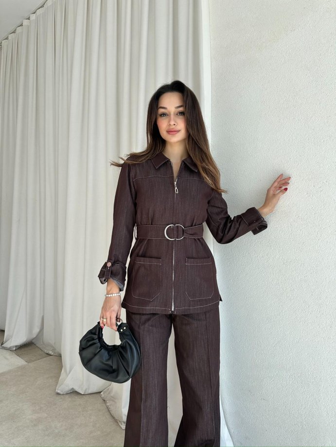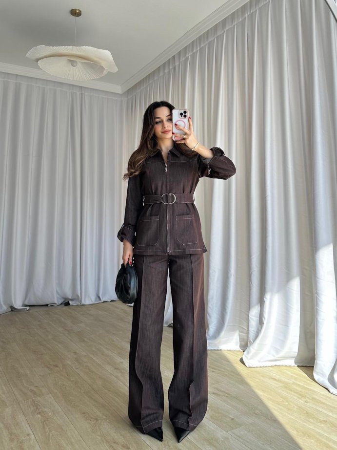 Takım üstü kemerli, önden fermuarlı ve ceplidir.