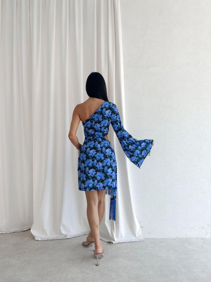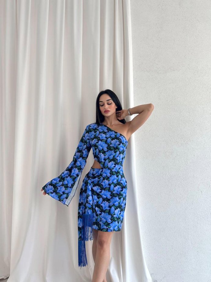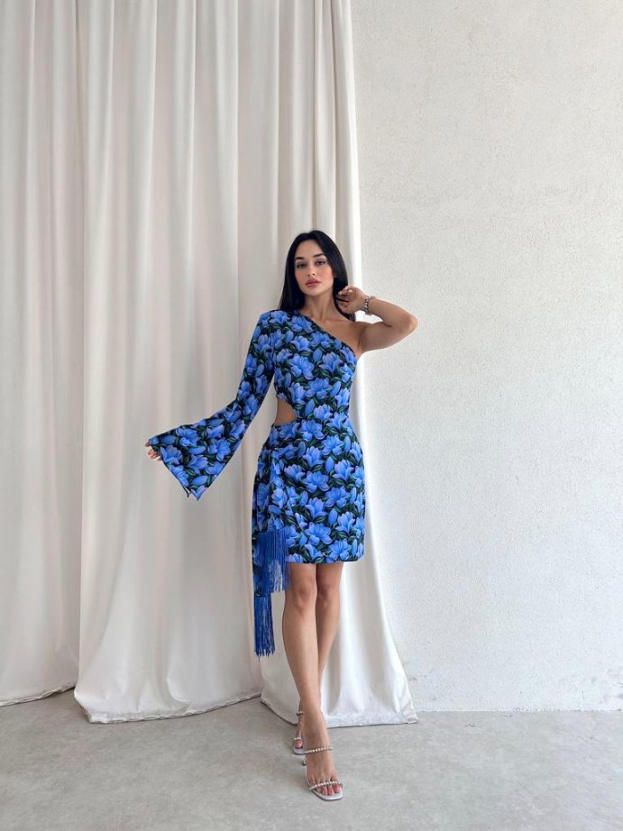 Püskül Detaylı Mini SOLEİL Elbise 4810 - Mavi
