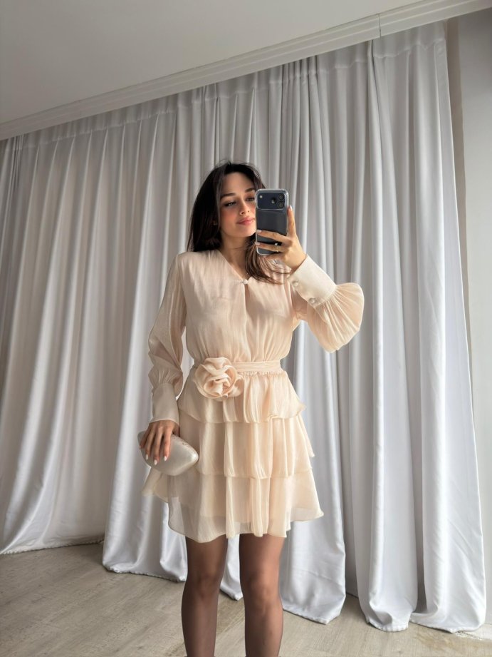 MONJE Kabartma Gül Desenli Mini Elbise 8974 - Krem Rengi