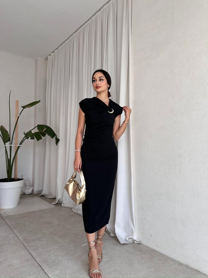 WALERY Omuz Tokalı Midi Elbise 9052 - Siyah