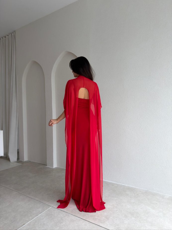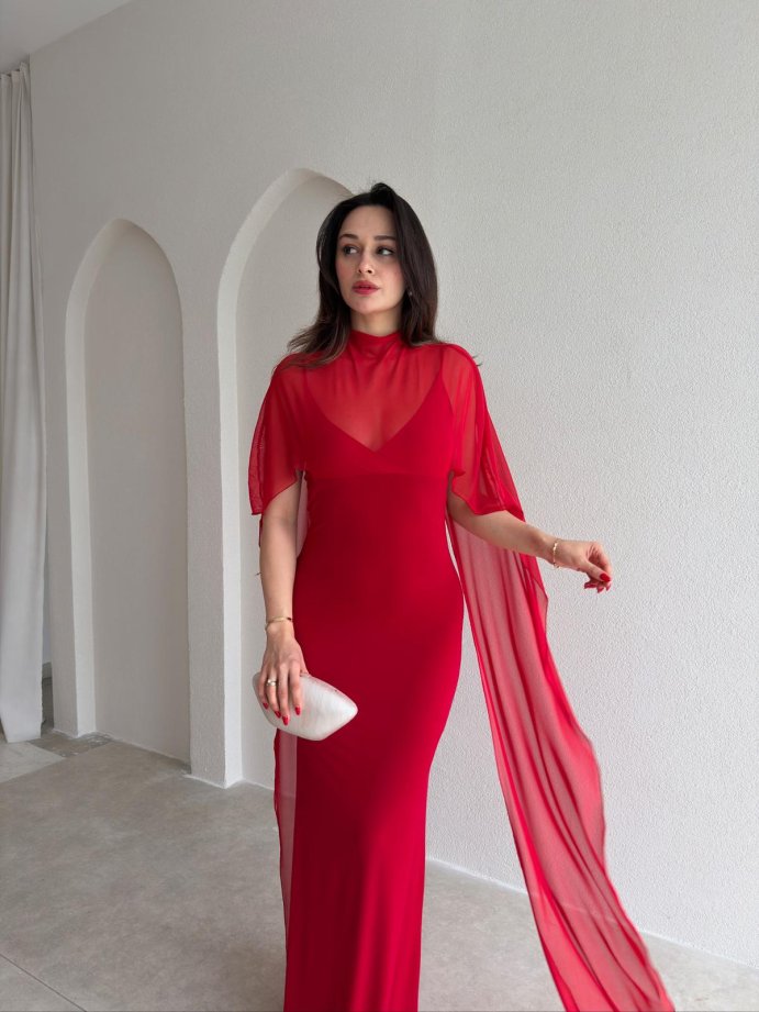 ROBBY Tül Parçalı Maxi Elbise 1819 - Kırmızı
