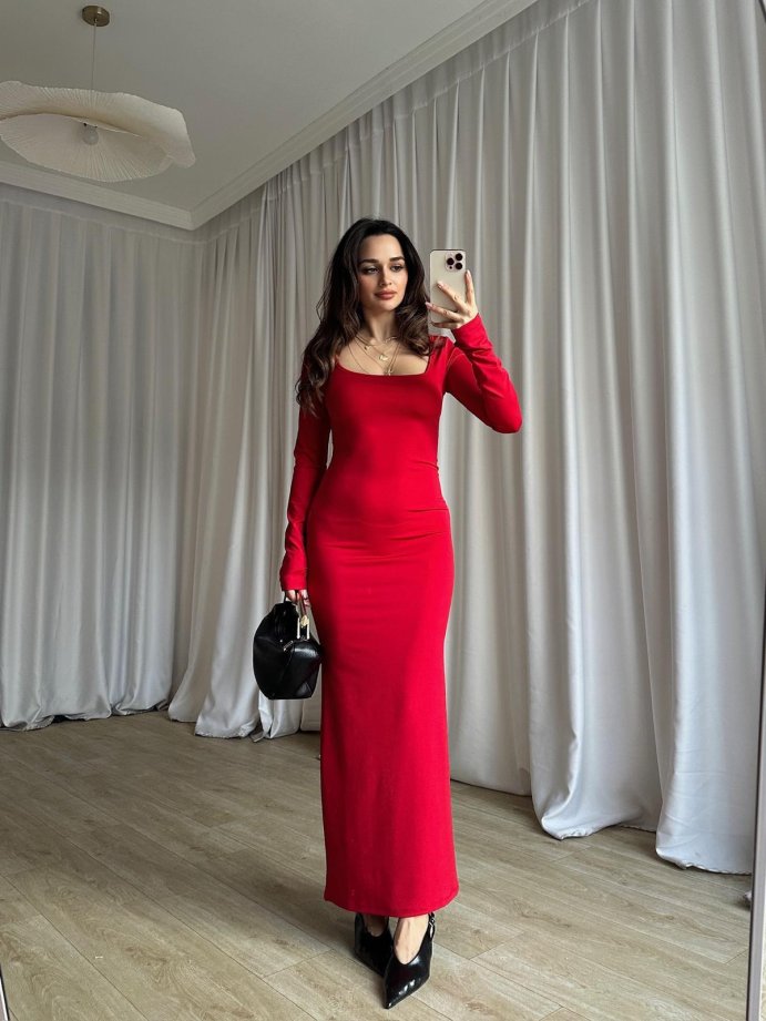 SANGRİA Kare Yaka Maxi Elbise tam kalıplıdır.