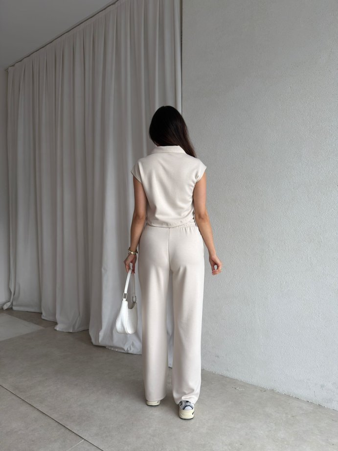 Takım cepli, beli lastikli ve bağcıklıdır.