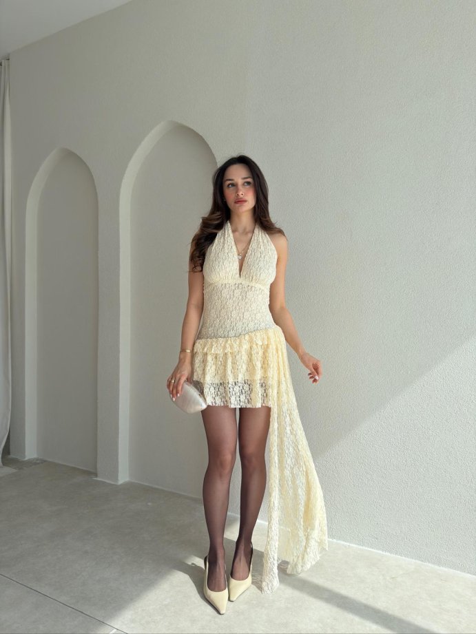 SHELTON Dantelli Mini Elbise 0101 - Sarı