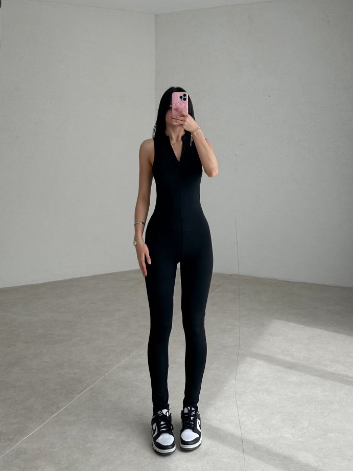 Sıfır Kol Fermuarlı Lacey Tulum - Siyah 0940