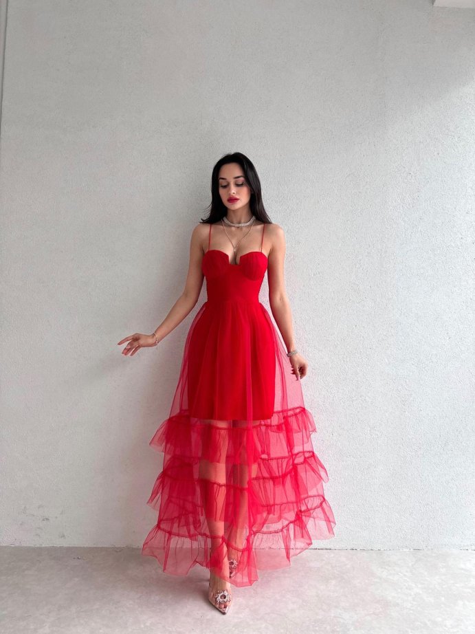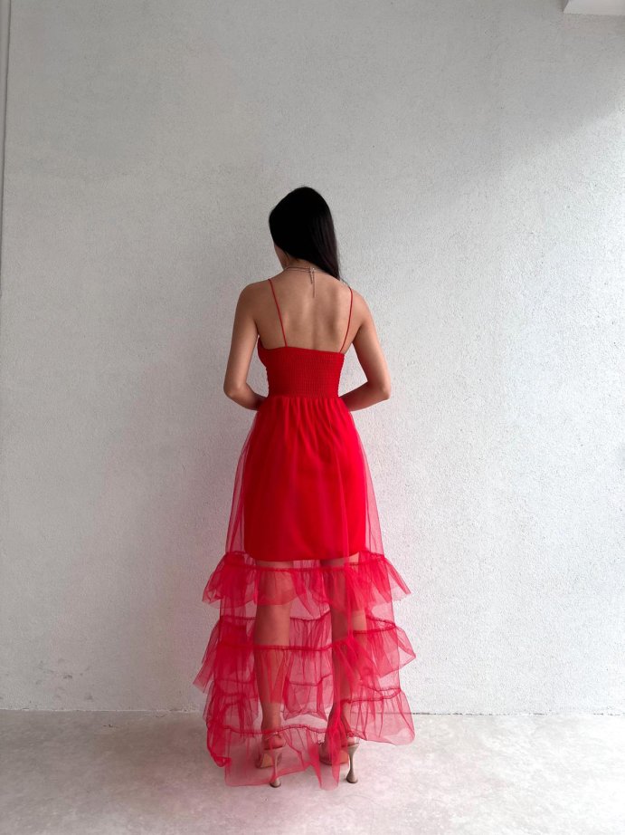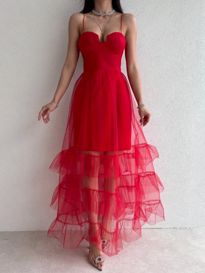 Tasarım Tül Detaylı LAWLESS Elbise - kırmızı