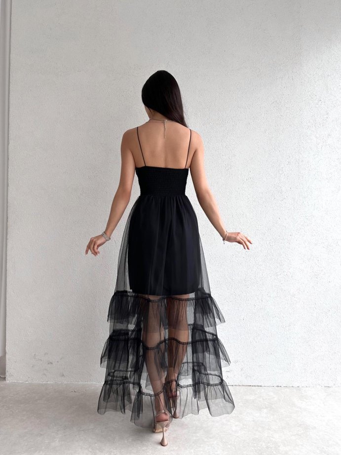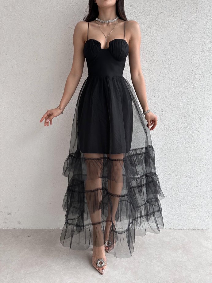 Tasarım Tül Detaylı LAWLESS Elbise - Siyah