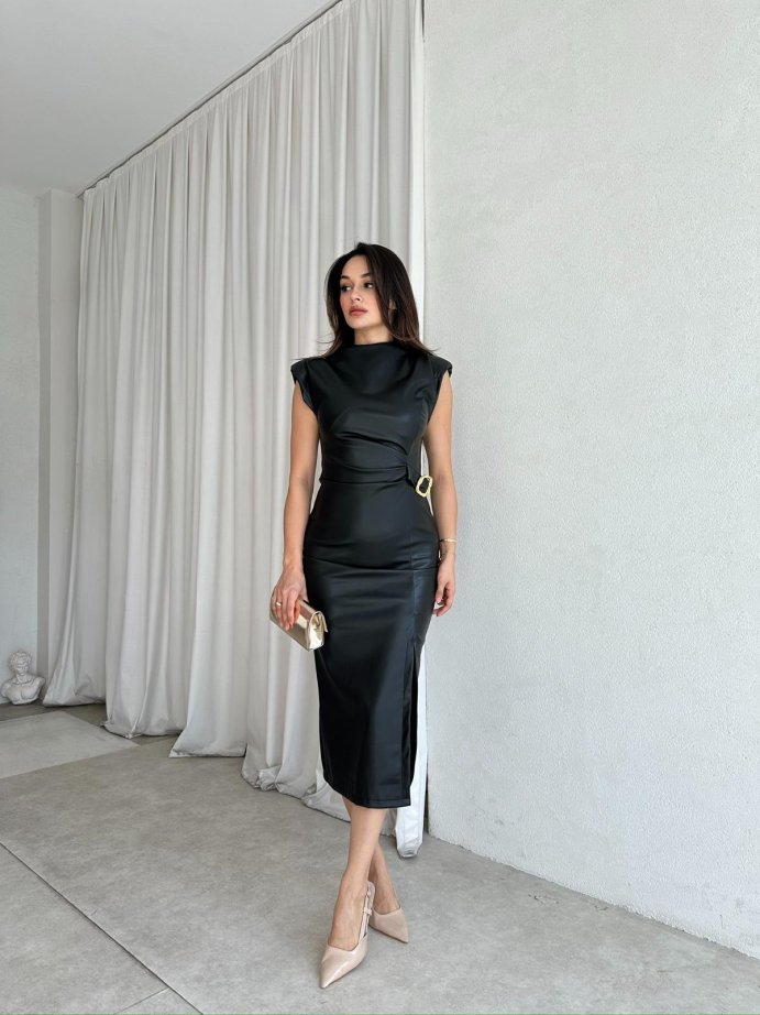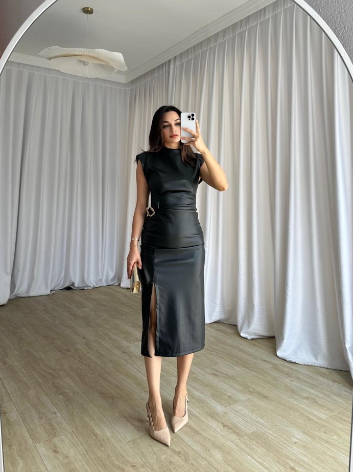 TAYLOR Midi Deri Elbise tam kalıplıdır.