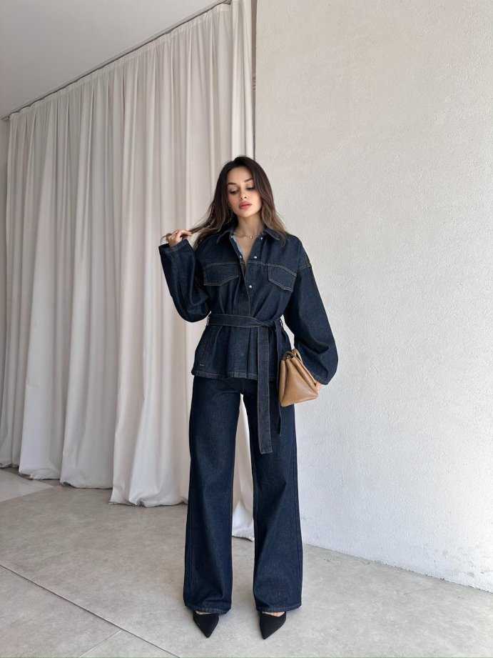 Takım denim kumaştır, kemerlidir.