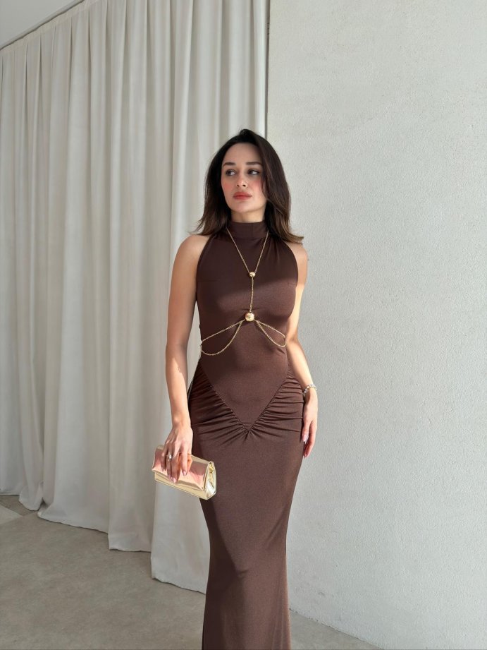 TOMY Aksesuarlı Maxi Elbise 1698 - Acı Kahve