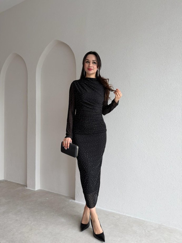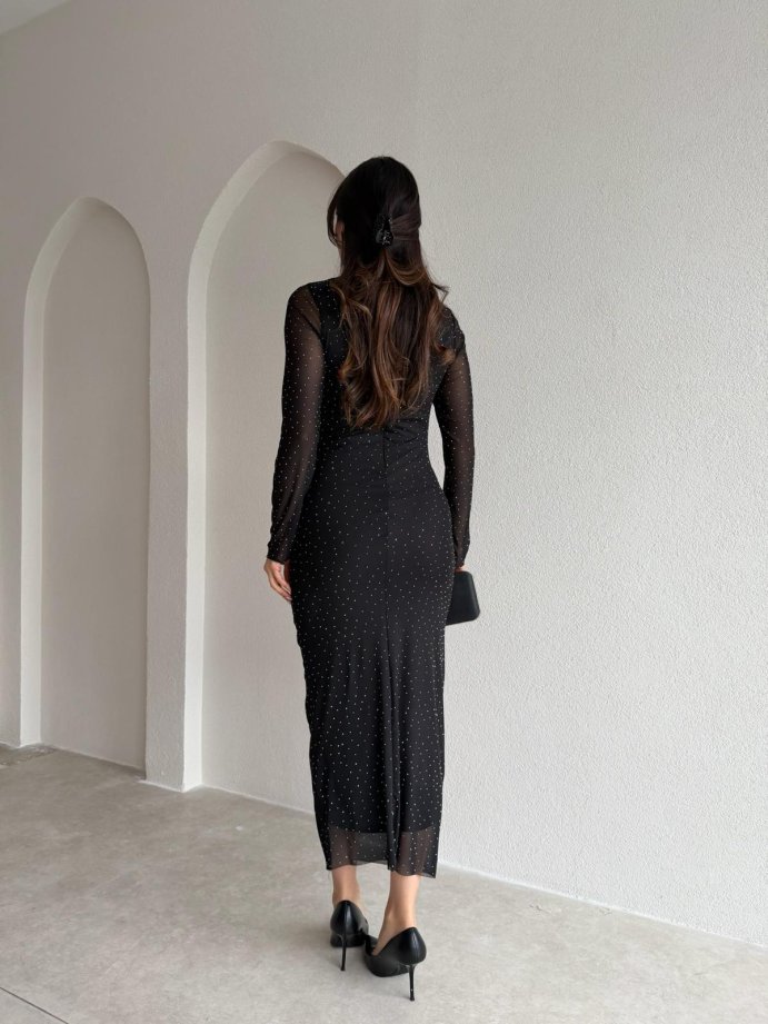 TROY Taşlı Midi Elbise 3882 - Siyah