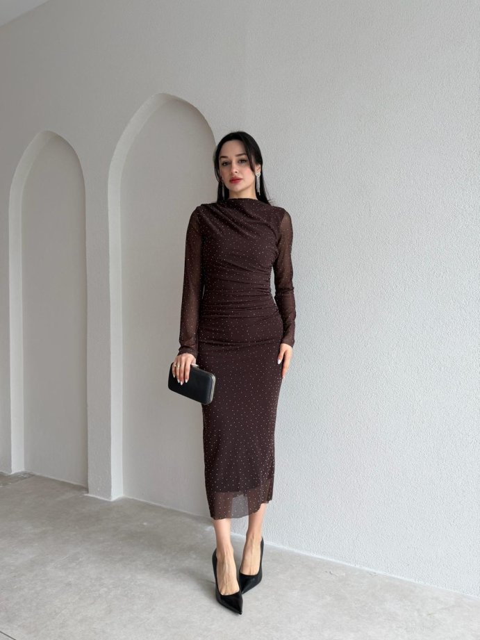 TROY Taşlı Midi Elbise 3882 - Acı Kahve