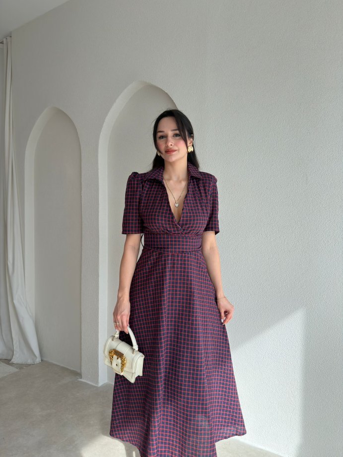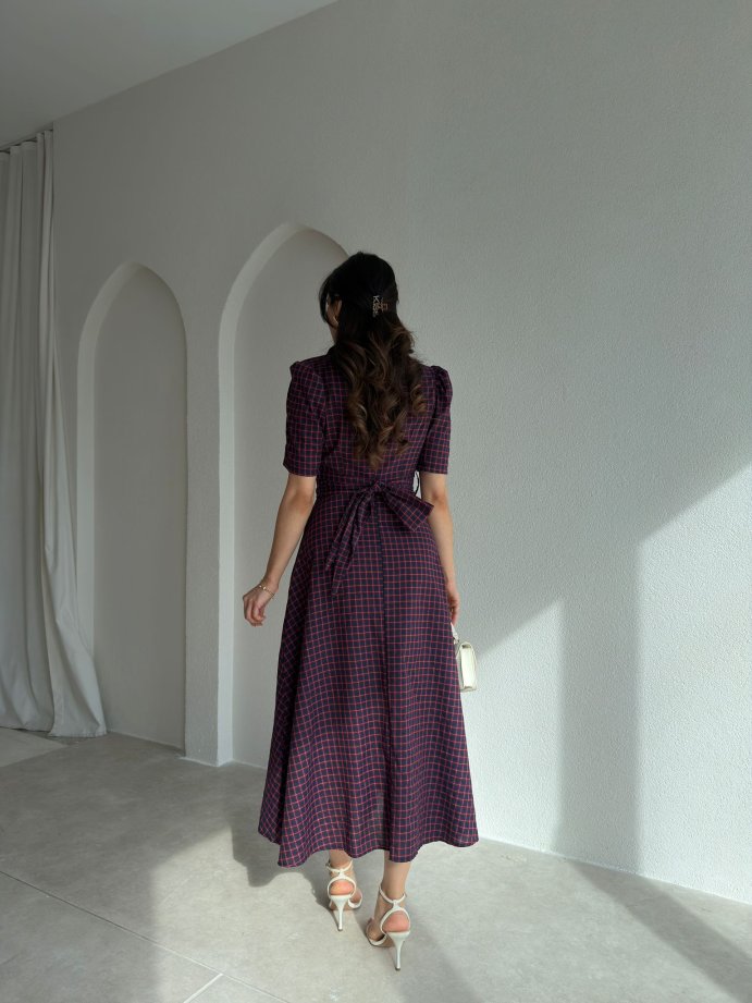 VALENCİA Ekoseli Midi Elbise 8996 - Mürdüm