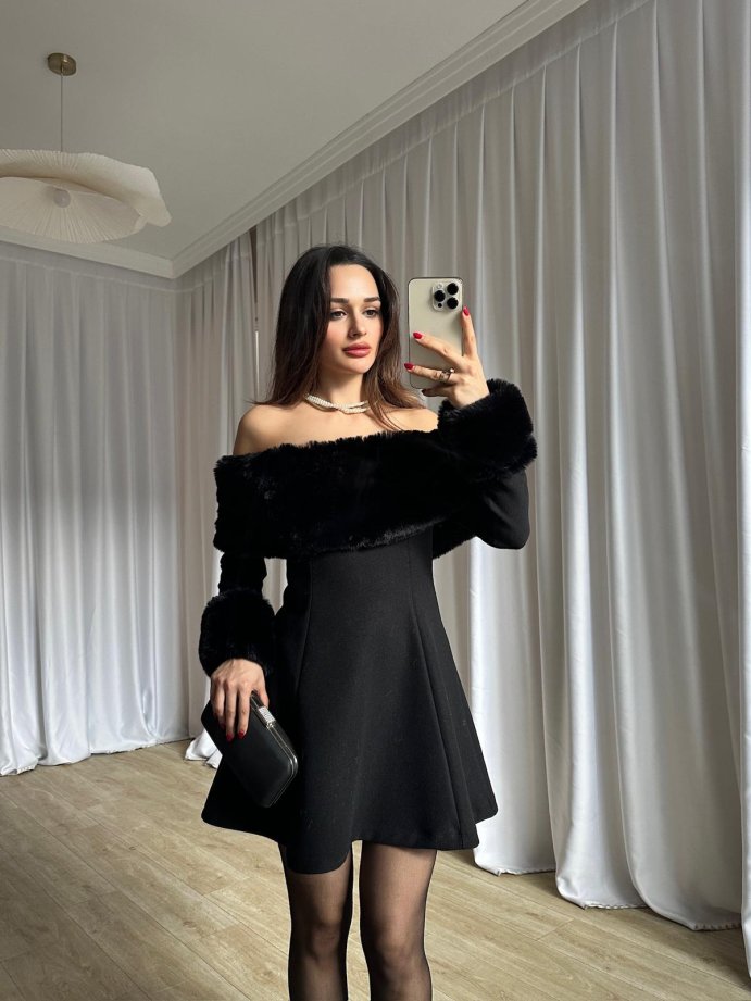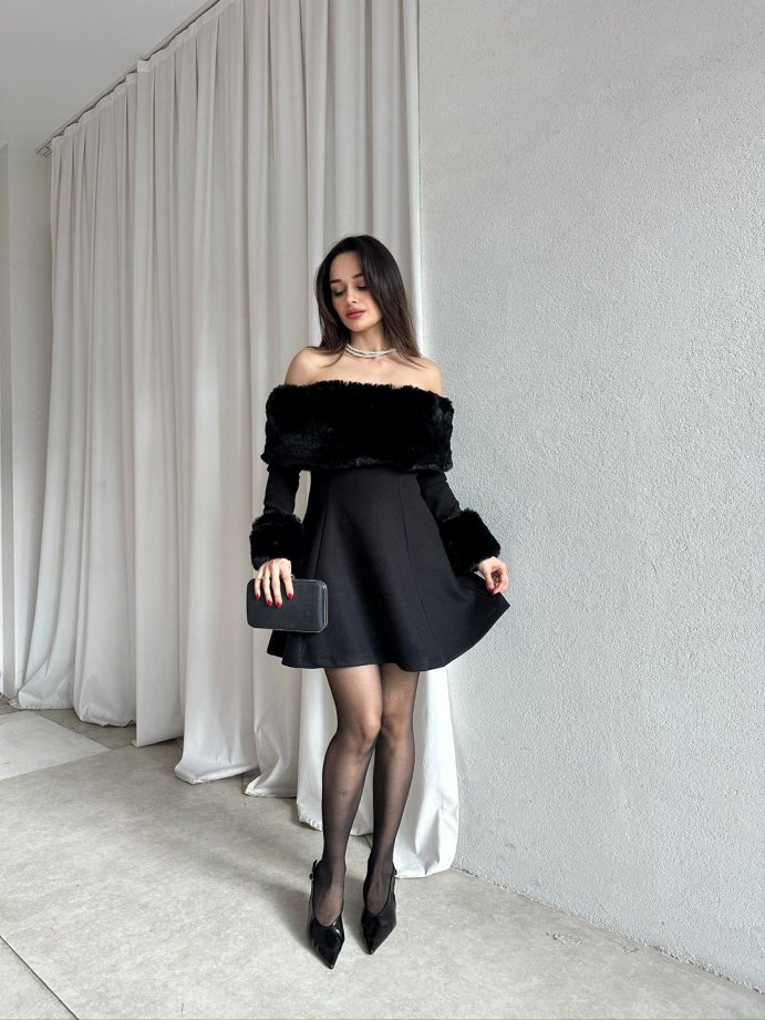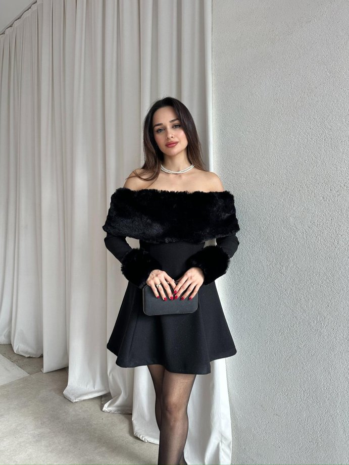 VİOLET Kürk Yaka Mini Elbise tam kalıplıdır.
