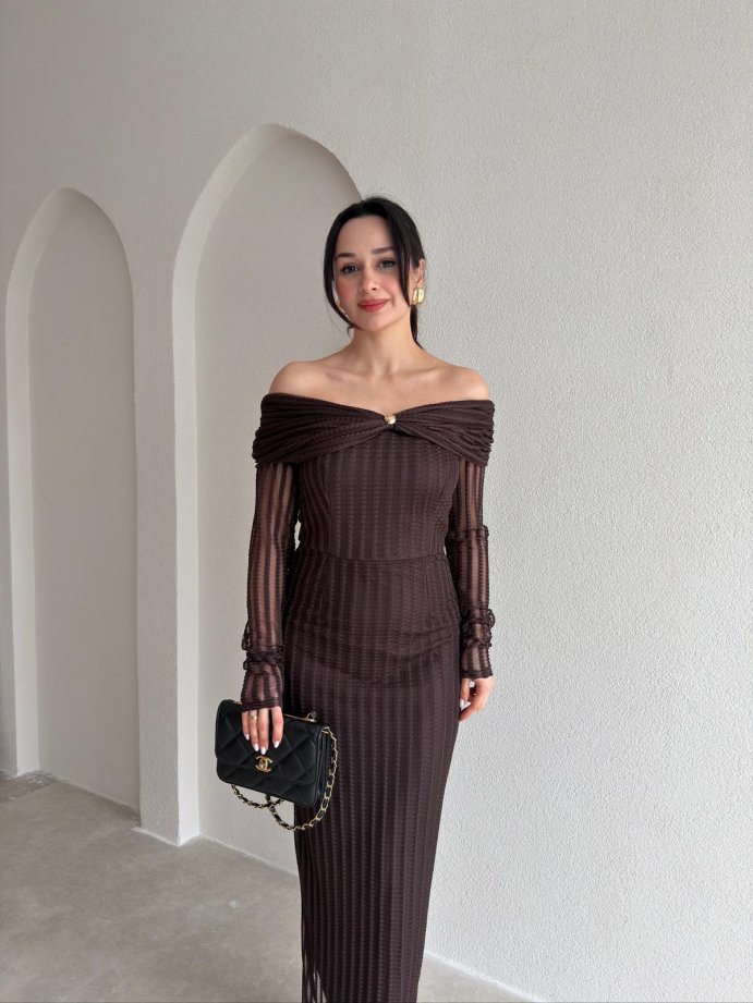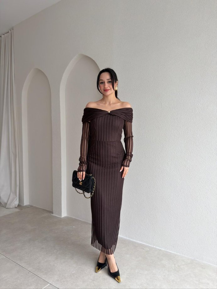 JULİA Taş Desenli Midi Elbise 9068 - Acı Kahve