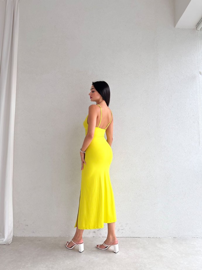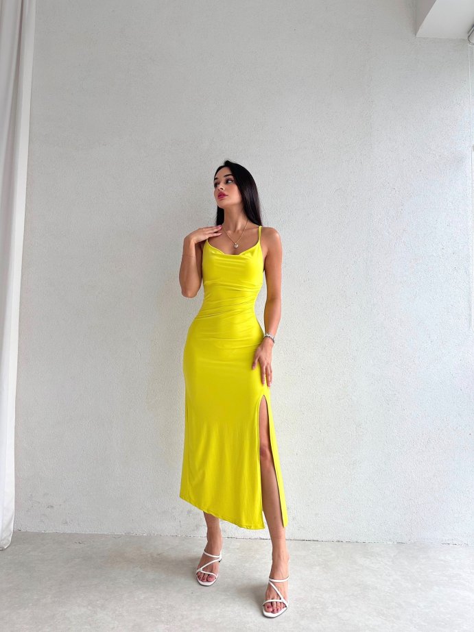 Yan Yırtmaç Detaylı Midi STEW Elbise 4292 - Sarı