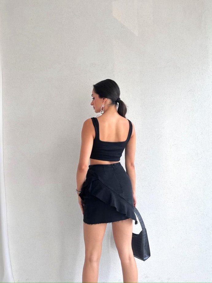 Skirt is jean fabric.